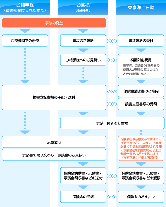 保険期間中に日本国内において患者さんを死傷させてしまったり法律上の賠償責任を負ってしまった場合の連絡先、賠償責任の事故の解決・保険金のお支払いの基本的な流れは下図の通りとなります。